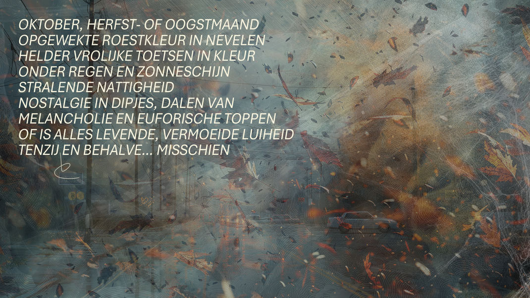 ‘Deugdpronkerij waar dan ook’ is een beeldgedicht waarin beeld en taal samen een subtiele maatschappijkritiek vormen. Op het eerste gezicht zien we een eenvoudige tafel, achteloos bedekt met herfstbladeren. Maar wat lijkt op een natuurlijke scène, krijgt door de tekst een scherpere betekenis.
