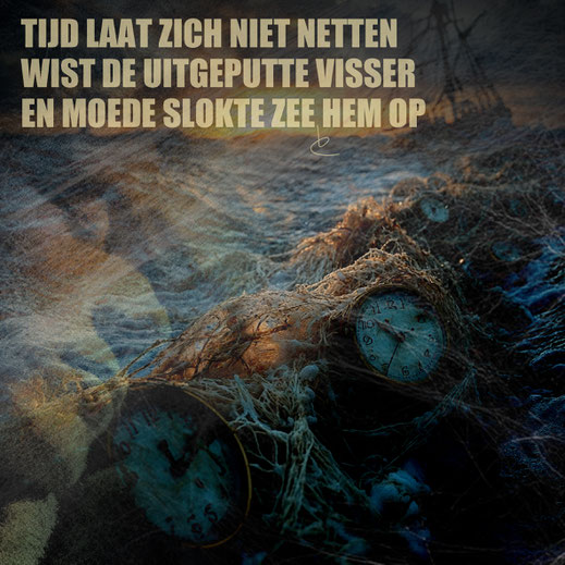 Bij dit hoopje restanten bleef de man zitten, zwijgend denkend, tot hij de eerste golfjes van het opkomende tij aan zijn voeten voelde.